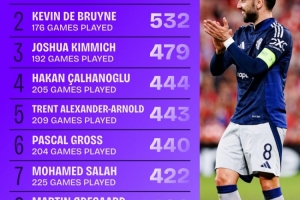 4、恰爾汗奧盧:205場創(chuàng)造444次機會