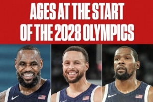 如果屆時庫里、詹姆斯、甚至是杜蘭特參加洛杉磯奧運會,他們?nèi)说哪挲g將分別是43歲、40歲和39歲。