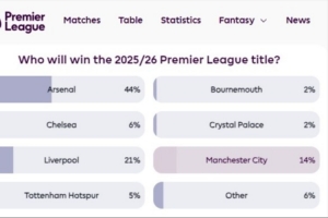 誰能奪冠?英超官網(wǎng)球迷投票:槍手44%第一,紅軍21%曼城14%