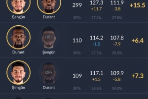 杜蘭特和申京都不在場時(shí),火箭進(jìn)攻效率92.1,防守效率150.1,凈效率-58。
