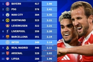 體育資訊11月20日訊 德國轉會市場統(tǒng)計了近5年球隊在五大聯(lián)賽中的場均進球數(shù)量,并列出榜單,拜仁2.86球居首,巴黎、曼城二三位。