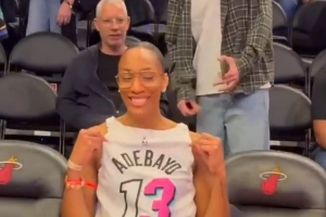 賽前,阿德巴約女友、本賽季W(wǎng)NBA總冠軍并包攬DPOY、MVP和FMVP的阿賈·威爾遜身穿男友球衣現(xiàn)場(chǎng)觀戰(zhàn),前后反穿專門露出阿德巴約的名字與號(hào)碼。