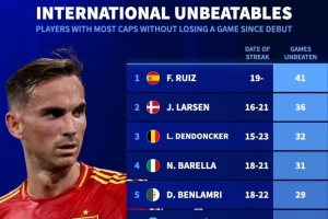 體育資訊11月20日訊 德國轉(zhuǎn)會市場統(tǒng)計了本世紀(jì)球員國家隊首秀之后的連續(xù)不敗場次數(shù)據(jù),并列出榜單,法比安·魯伊斯連續(xù)41場不敗居首。