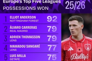 體育資訊11月22日訊 五大聯(lián)賽戰(zhàn)火即將重燃,數(shù)據(jù)機構(gòu)squakwa也統(tǒng)計了本賽季至今的五大聯(lián)賽球員贏得球權(quán)次數(shù)情況,諾丁漢森林中場埃利奧特·安德森居首。