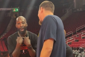 賽前,掘金球星約基奇在場邊和火箭老將杰夫·格林熱聊一波,雙方曾在掘金當(dāng)過隊(duì)友。