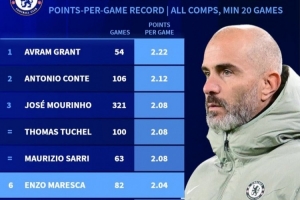 切爾西各項賽事隊史場均拿分榜:至少執(zhí)教20場比賽