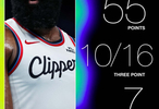 全場比賽,快船球星哈登出戰(zhàn)35分鐘,26中17,三分16中10得到55分3板7助攻1搶斷。