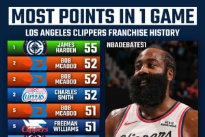 快船隊史得分榜前十!哈登55分第一 鮑勃·麥卡杜5次50+上榜5次