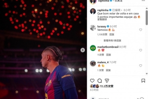 本場比賽也是巴薩回歸諾坎普球場首戰(zhàn),迎來傷愈復(fù)出的拉菲尼亞在社媒曬照寫道:“回家的感覺真棒!球隊(duì)取得關(guān)鍵三分”
