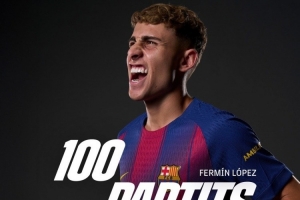 此役是費(fèi)爾明的諾坎普首秀,也是他為巴薩出戰(zhàn)的第100場比賽,巴薩官方社媒曬出海報,祝賀他達(dá)成巴薩百場里程碑。