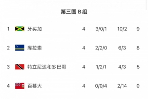 在B組第4輪較量中,此前領跑該小組的庫拉索1-1戰(zhàn)平特立尼達和多巴哥,牙買加則4-0大勝百慕大。本輪結束后,牙買加9分登頂,庫拉索8分第二,特立尼達和多巴哥5分第三,百慕大0分墊底。