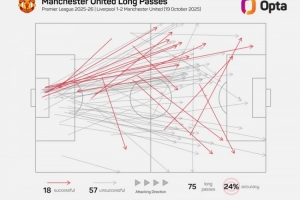 據(jù)Opta統(tǒng)計(jì),曼聯(lián)本場(chǎng)比賽傳球294次,其中有75次長(zhǎng)傳,占比25.5%、2017年12月3-1擊敗阿森納(占比27.9%)之后,這是曼聯(lián)在英超長(zhǎng)傳占比最高的比賽。