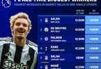 #曼城[超話]# 德轉此前更新了足壇球員身價,并盤點了英超球員在單次更新中身價漲幅最高的榜單,具體如下: