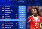 前20名榜單中,英超占11席;西甲和意甲各占3席;德甲2席;法甲1席。