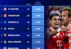 拜仁場(chǎng)均打進(jìn)3.64球高居榜首,另一支德甲球隊(duì)法蘭克福場(chǎng)均打進(jìn)3球排名第二,馬賽以場(chǎng)均2.6球排名第三。