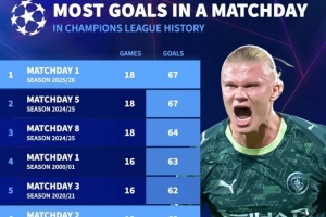 值得一提的是,本賽季歐冠聯(lián)賽階段第三輪今日9場比賽出現(xiàn)43粒進(jìn)球,剩余9場比賽打進(jìn)25球就可以打破紀(jì)錄。