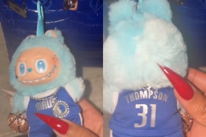 她曬出了一個特別的拉布布,這個拉布布穿著克萊的獨行俠31號球衣,脖子上還帶著獨行俠Logo的大鏈子。