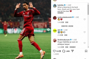 埃基蒂克攻破老東家球門后沒有慶祝,他在社交媒體上曬出比賽照片,配文:“能夠回到這里真是太好了(上天的恩賜),感謝你們的愛,祝一切順利?!?/p>